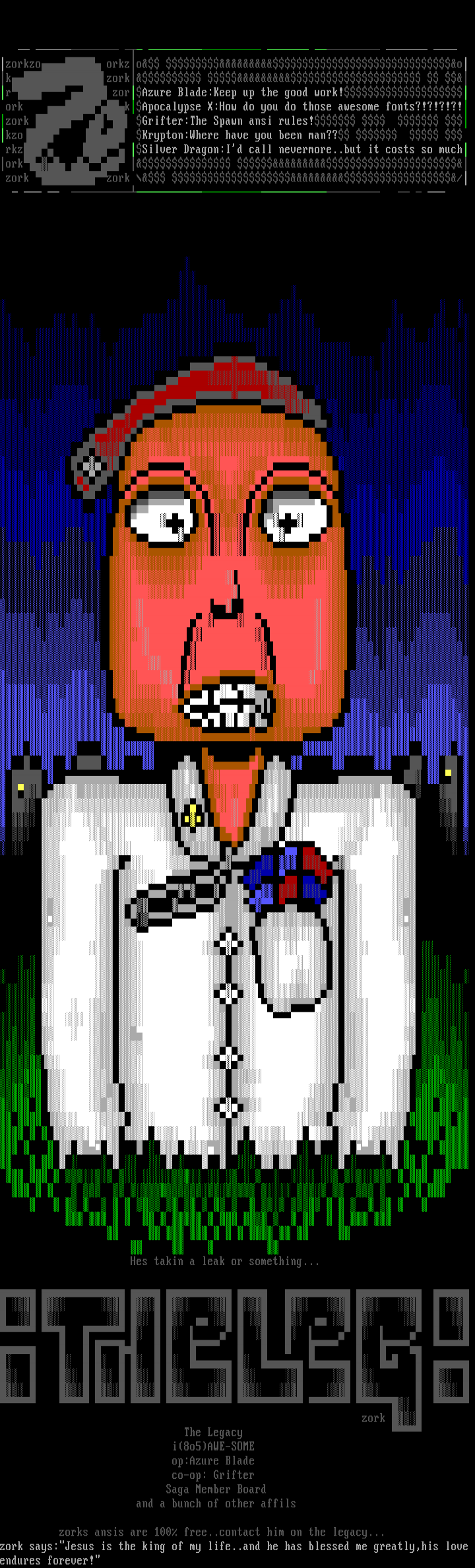 ork kApocalypse X:How do you do those awesome fonts?!?!?!?! zork Grifter:The Spawn ansi rules! kzo Krypton:Where have you been man??