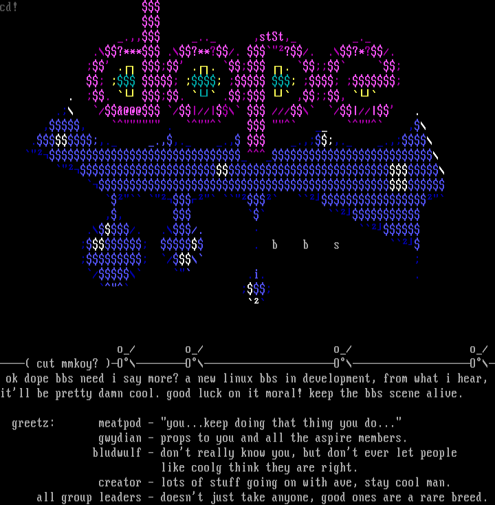 cut mmkoy? OOOO ok dope bbs need i say more? a new linux bbs in development, from what i hear, itll be pretty damn cool. good luck on it moral! keep the bbs scene alive.