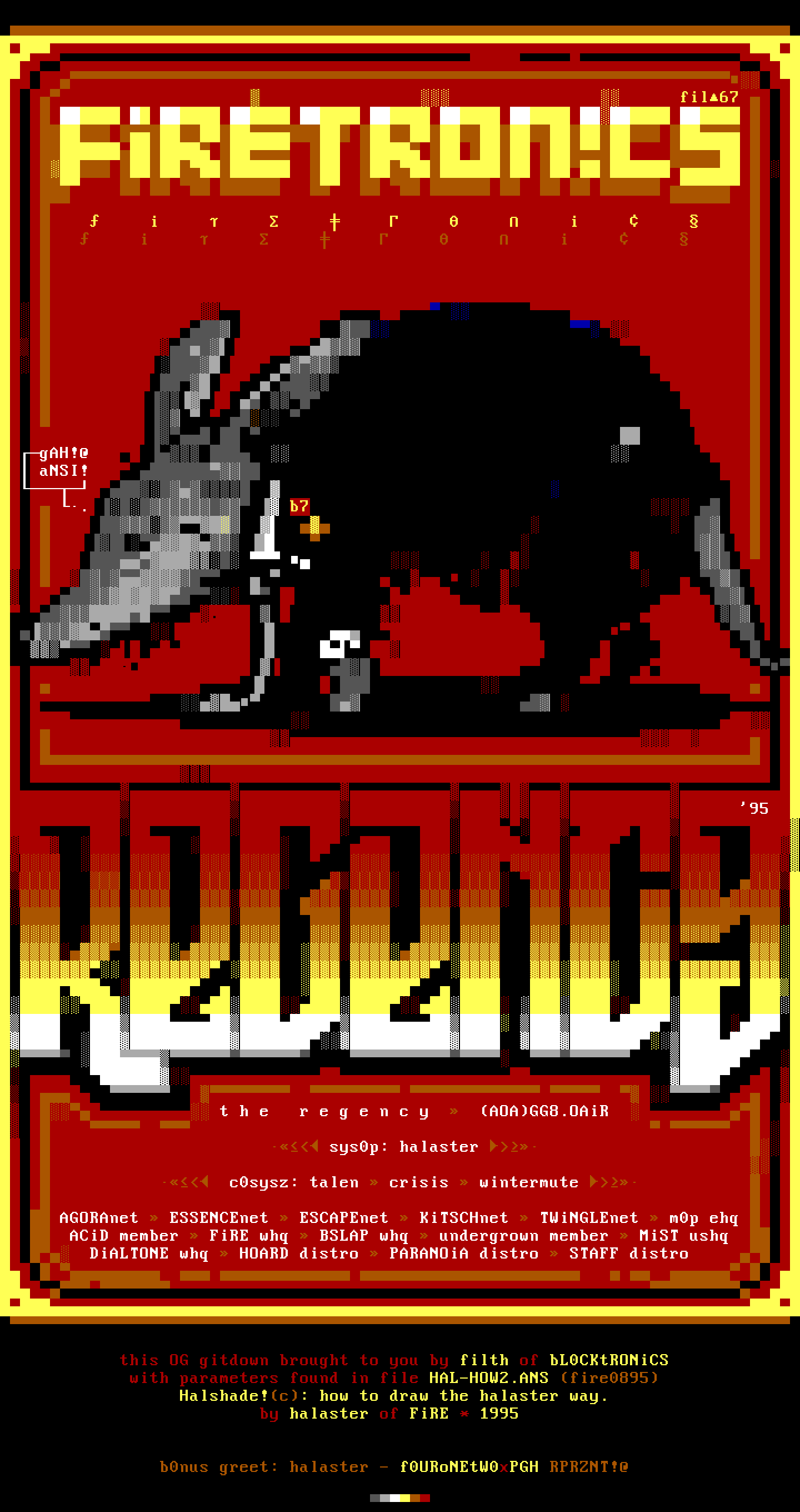 fil67 i i i i HI XER0!@!@! gAH!@ aNSI! . b7 . 95 t h e r e g e n c y AOAGG8.OAiR sys0p: halaster c0sysz: talen crisis wintermute AGORAnet ESSENCEnet ESCAPEnet KiTSCHnet TWiNGLEnet m0p ehq ACiD member FiRE whq BSLAP whq undergrown member MiST ushq DiALTONE whq HOARD distro PARANOiA distro STAFF distro