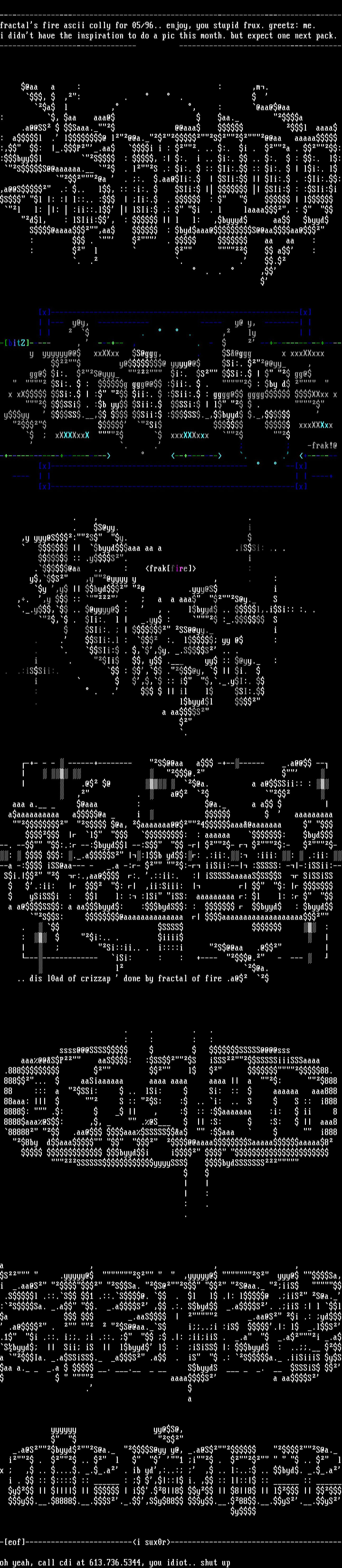 --------------------------------------------------------------------------------fractals fire ascii colly for 05/96.. enjoy, you stupid frux. greetz: me.