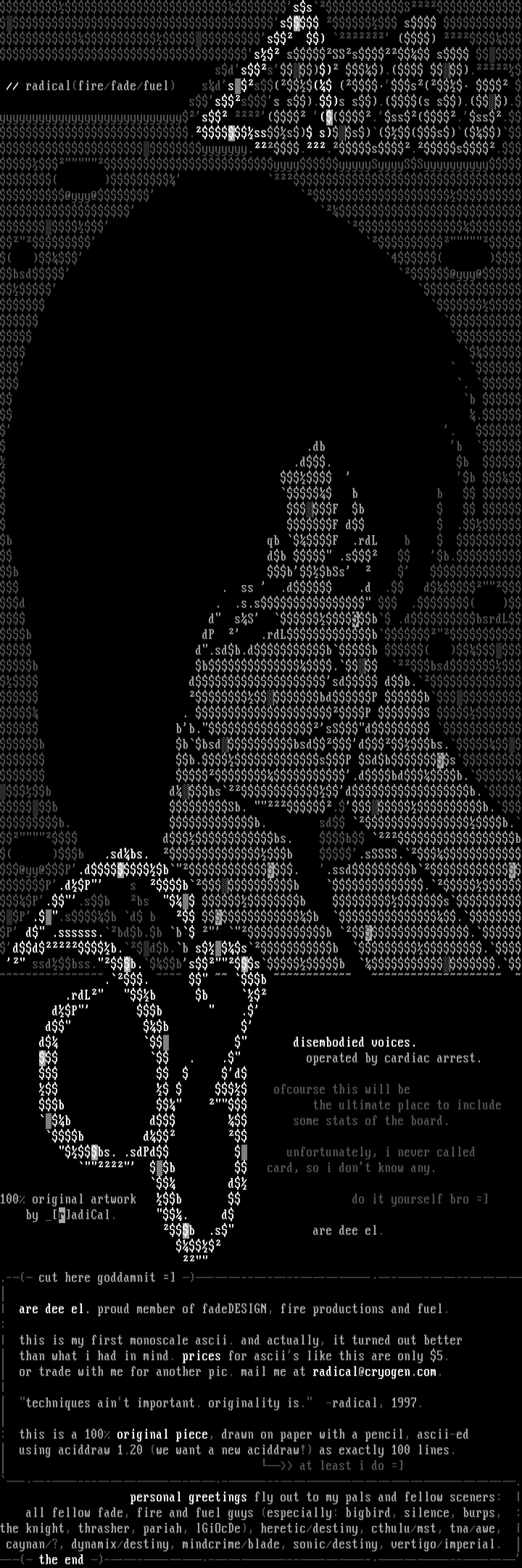 .- cut here goddamnit ------------------------- remember: its art, no feeling. godverdommij. are dee el. proud member of fadeDESIGN, fire productions and fuel.