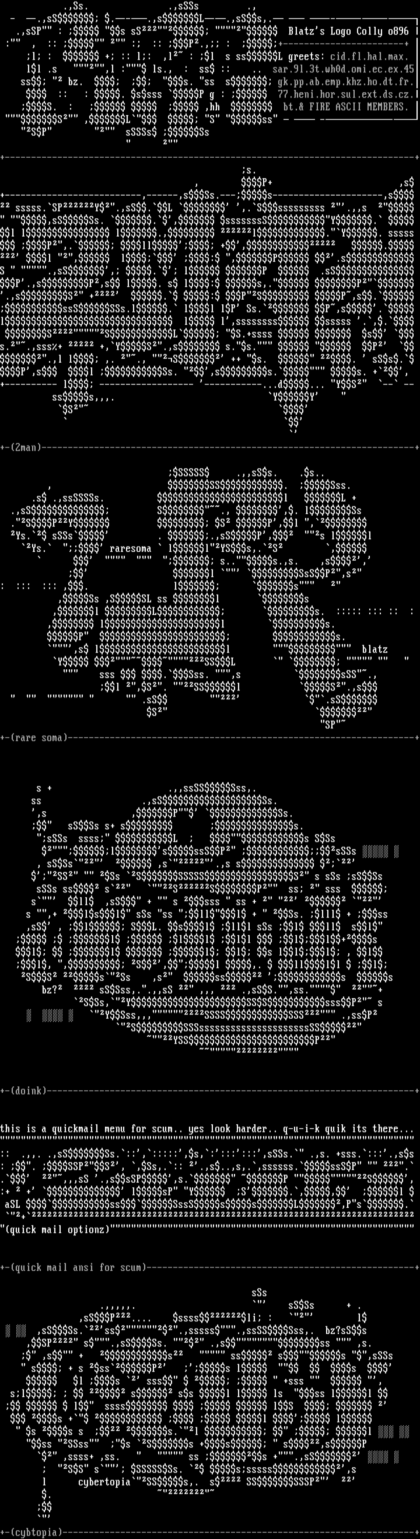 - -.,sS .--.,sL-.,sSs,. ---- .,sSP : s sS Blatzs Logo Colly o896 : , :: : :: P., : +-----------------------+ l : + :: l: ,l : l s ssL greets: cid.fl.hal.max. ll .s ,l : ls., : ss :: .. sar.9l.3t.wh0d.omi.ec.ex.45 ss bz. s. ss s gk.pp.ab.emp.khz.ho.dt.fr. :: : . ssss P g : 77.heni.hor.sul.ext.ds.cz. S. : ,hh bt. FIRE ASCII MEMBERS. S ,L S ss -- SP sSSSs Ss