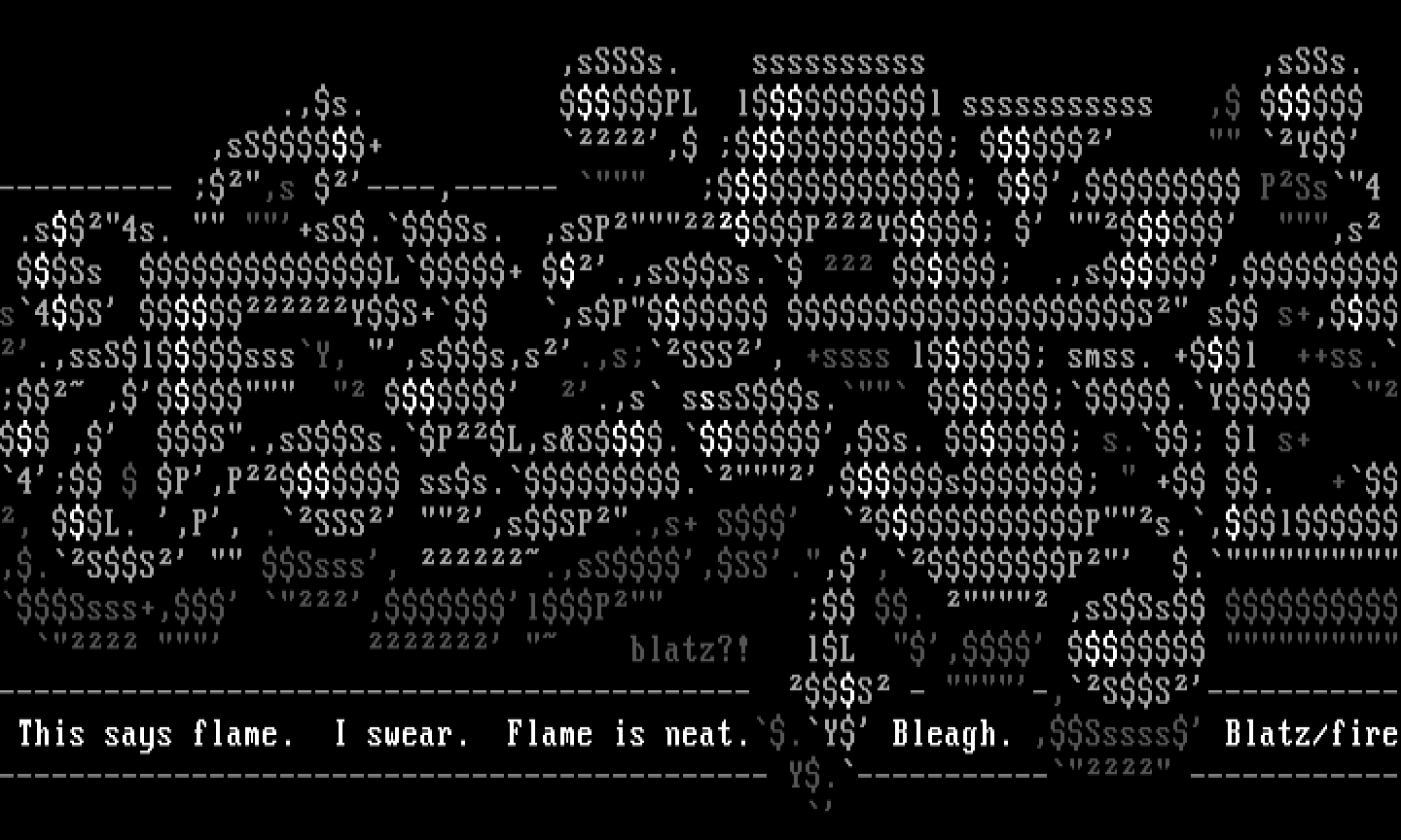 4 P,P sss..,s + . +, L. ,P, .SSS ,sSP.,s+ S Ps.,l,.SS Ssss, .,sS,SS.,,P .Ssss+, ,lP . ,sSSs blatz?! lL , ------------------------------------------- S - -,SS----------- This says flame. I swear. Flame is neat..Y Bleagh. ,Sssss Blatz/fire-------------------------------------------- Y.----------- ------------