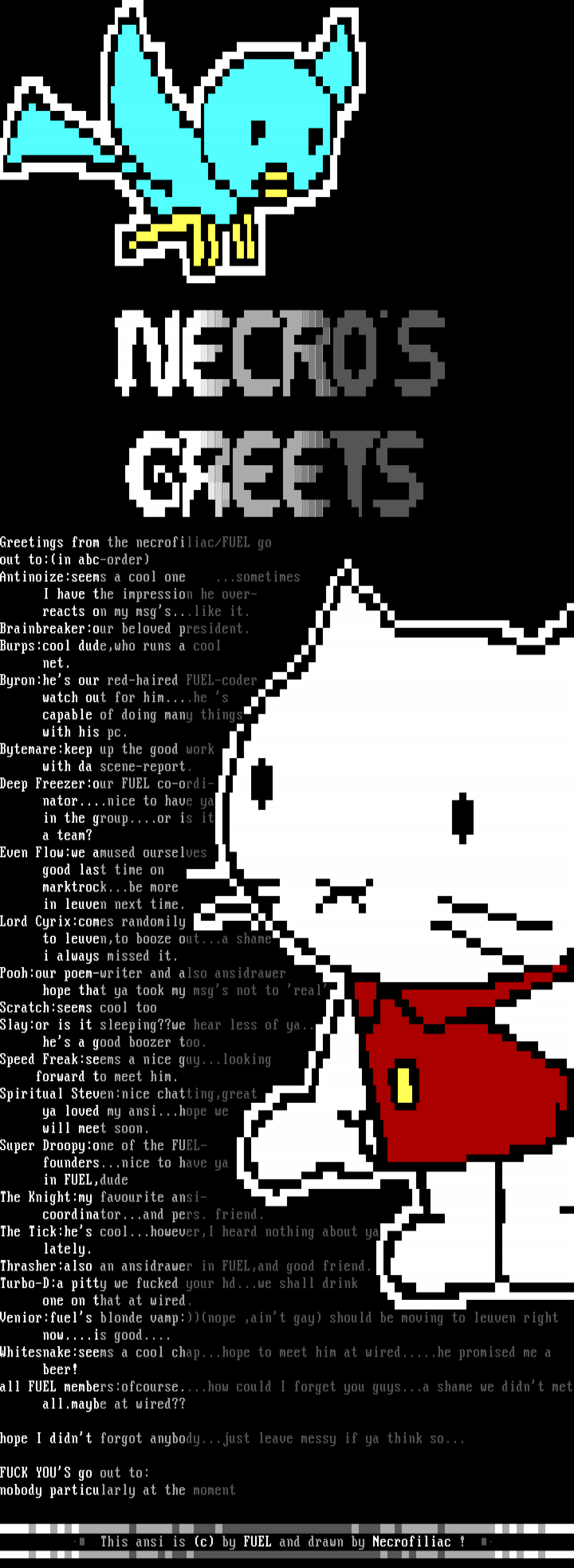 Super Droopy:one of the FUEL- founders...nice to have ya in FUEL,dude The Knight:my favourite ansi- coordinator...and pers. friend. The Tick:hes cool...however,I heard nothing about ya lately. Thrasher:also an ansidrawer in FUEL,and good friend. Turbo-D:a pitty we fucked your hd...we shall drink one on that at wired. Venior:fuels blonde vamp:nope ,aint gay should be moving to leuven right