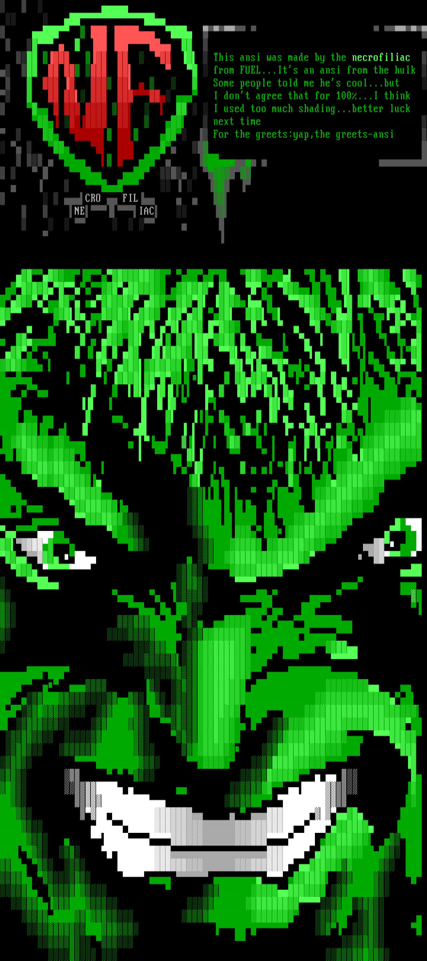 This ansi was made by the necrofiliac from FUEL...Its an ansi from the hulk Some people told me hes cool...but I dont agree that for 100...I think