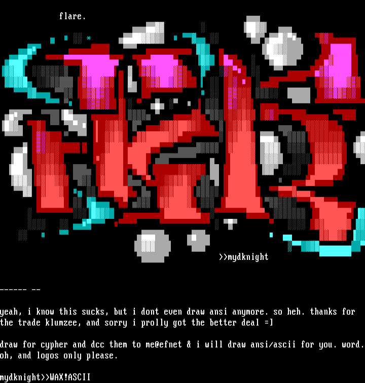 yeah, i know this sucks, but i dont even draw ansi anymore. so heh. thanks for the trade klumzee, and sorry i prolly got the better deal