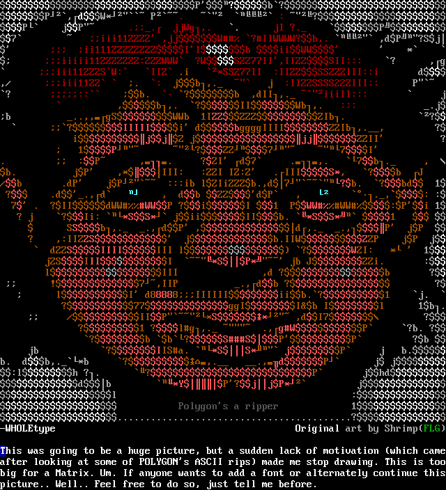 This was going to be a huge picture, but a sudden lack of motivation which cameafter looking at some of POLYGONs ASCII rips made me stop drawing. This is toobig for a Matrix. Um. If anyone wants to add a font or alternately continue thispicture.. Well.. Feel free to do so, just tell me before.