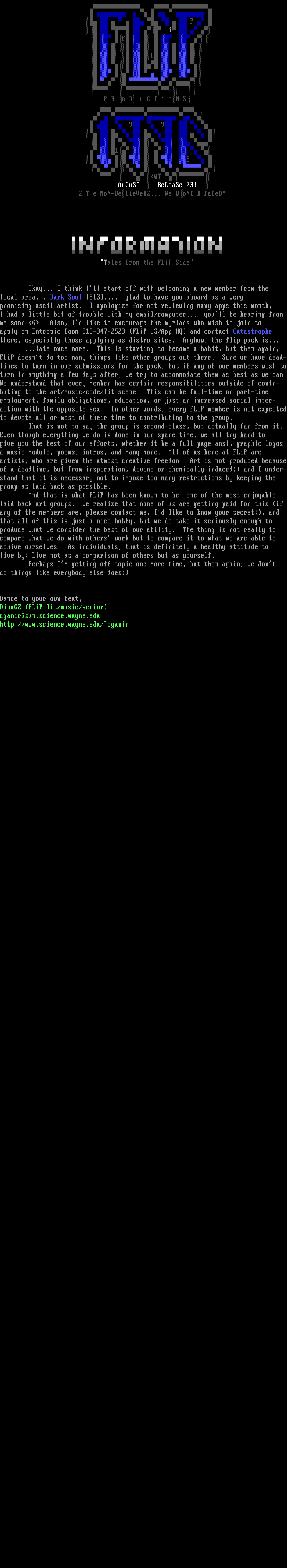 give you the best of our efforts, whether it be a full page ansi, graphic logos,a music module, poems, intros, and many more. All of us here at FLiP are
