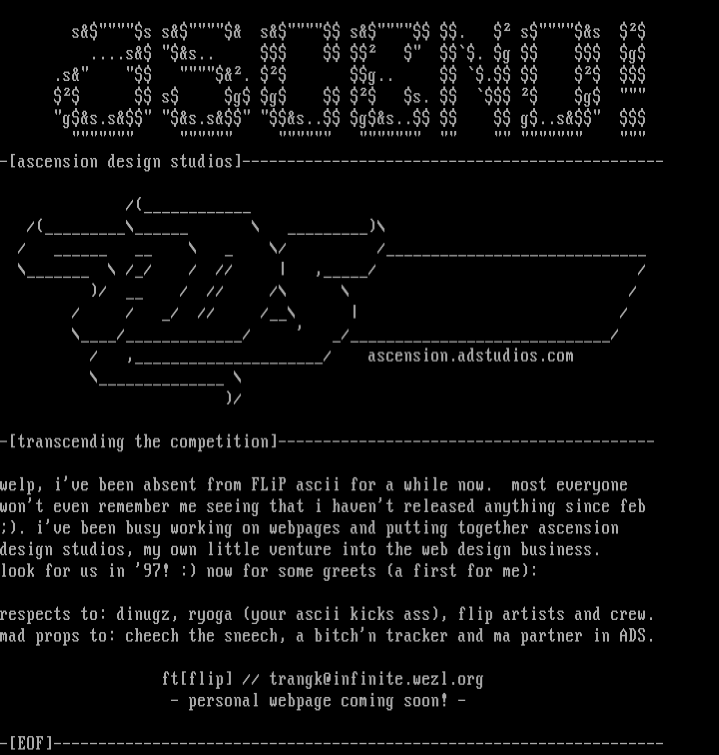 respects to: dinugz, ryoga your ascii kicks ass, flip artists and crew.