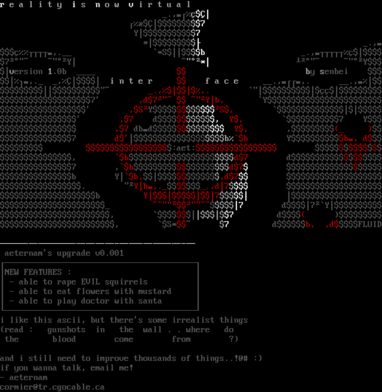 * .,,. *Sb .,7 Y * Yversion 1.0b by senbei ,. , i n t e r f a c e .,,. ., .,,. 7 ,d7 Yb, Y ,SYS, ,7 d, Y, 7 Y ,7 dbd Y, , 7 dbb Yb, d :aet: , bd7 d7 ,bd7 b Yb,,d7 . Yb,..,d7 b Y7 7 d7Y, 7 d , S* 7 db, ,dFLUID