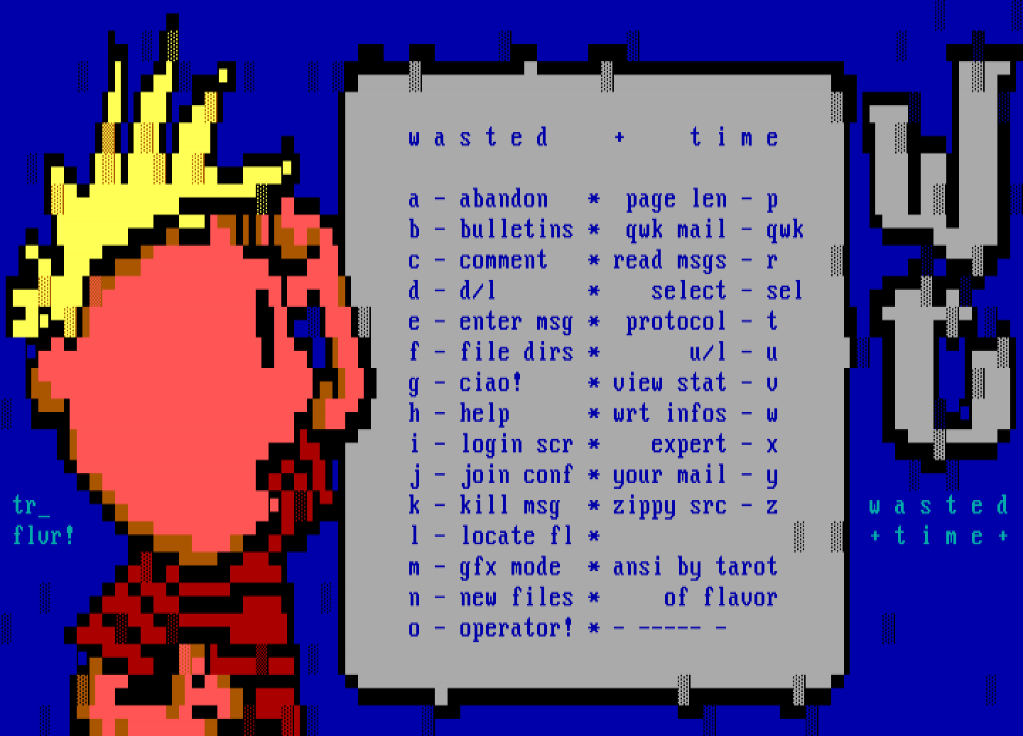e - enter msg * protocol - t f - file dirs * u/l - u g - ciao! * view stat - v h - help * wrt infos - w i - login scr * expert - x j - join conf * your mail - y