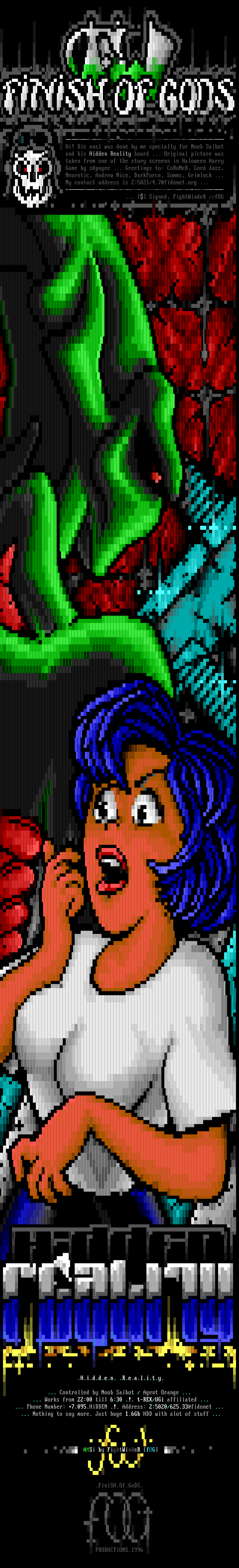 ...and special hidden greets to Neurotic : fW ------ Hi! Diz ansi was done by me specially for Noob Saibot and his Hidden Reality board ... Original picture was taken from one of the story screens in Haloween Harry Game by sApogee ... Greetings to: CoRoNeR, Lord Jazz, Neurotic, Andrew Nice, DarkForce, Somms, Grimlock ... My contact address is 2:5021/4.7@fidonet.org ... ------ fW ... Signed, FightWindeR //fOG fW fW//fOG fW fW fW fW fW fW/fOG hey! what are you lookin for?! wanna some hidden messages?! press / in acidview and getoutta here!