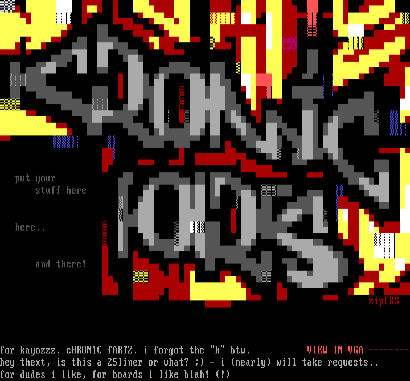 for kayozzz. cHRON1C fARTZ. i forgot the h btw. VIEW IN VGA --------hey thext, is this a 25liner or what? - i nearly will take requests..