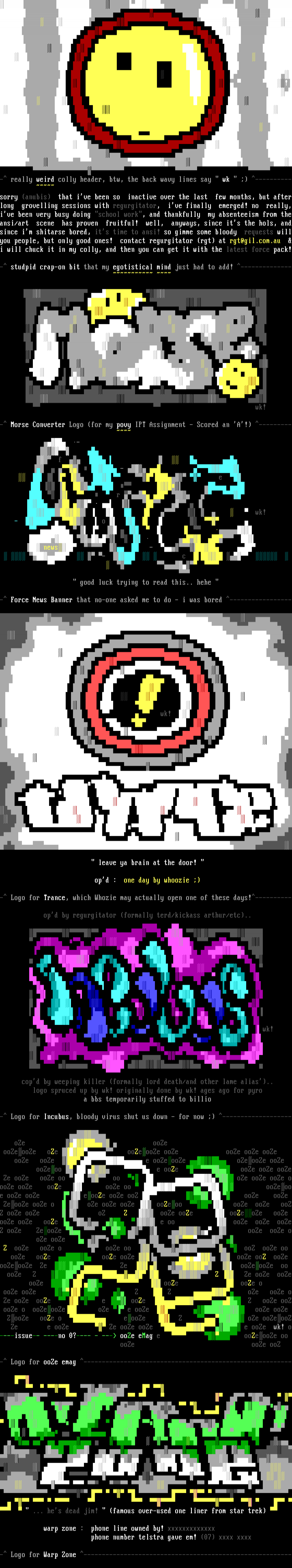 sorry anubis that ive been so inactive over the last few months, but afterlong grovelling sessions with regurgitator, ive finally emerged! no really,ive been very busy doing school work, and thankfully my absenteeism from theansi/art scene has proven fruitful! well, anyways, since its the hols, andsince im shitarse bored, its time to ansi! so gimme some bloody requests willyou people, but only good ones! contact regurgitator rgt at rgt@gil.com.au i will chuck it in my colly, and then you can get it with the latest force pack!