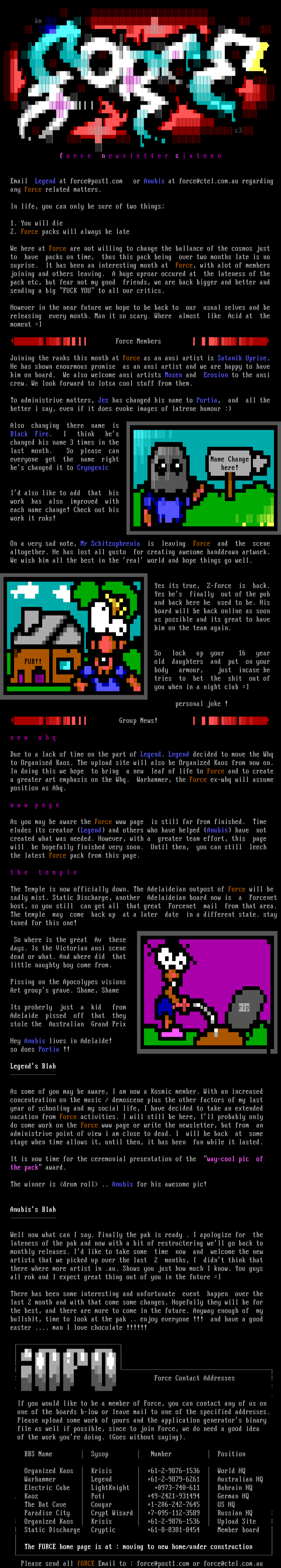 Joining the ranks this month at Force as an ansi artist is Satanik Uprise.