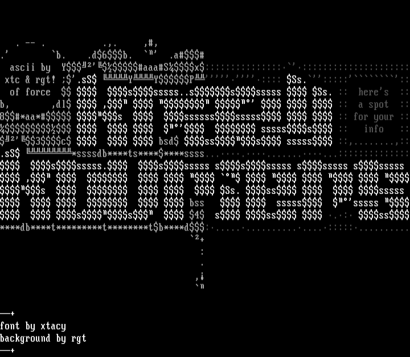 ascii by YaaaSx:::::::::::::::::::::::::::::::::::: xtc rgt! .sS YYP:::: Ss.::::::: of force ssssss..sssssss Ss. :: heres ::b, ,dl , :: a spot ::8*aa* s sssssssssss :: for your :: ssssss :: info ::3c bsd sss sssss ::,........,::.sS *ssssdb****ts********ssss..............:::::::::::::: ssssss. ssssss sssssss ssssss ssssss