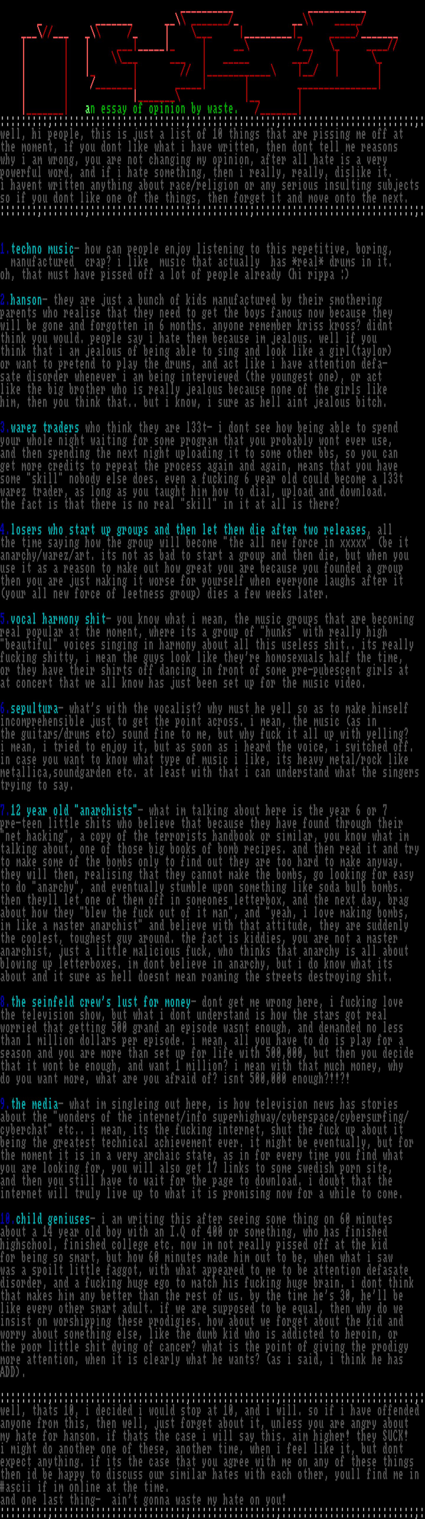 ::::::::::::::::::::::::::::::::::::::::::::::::::::::::::::::::::::::::::::well, hi people, this is just a list of 10 things that are pissing me off at