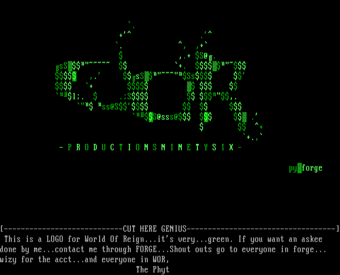 ----------------------------CUT HERE GENIUS----------------------------------- This is a LOGO for World Of Reign...its very...green. If you want an askee