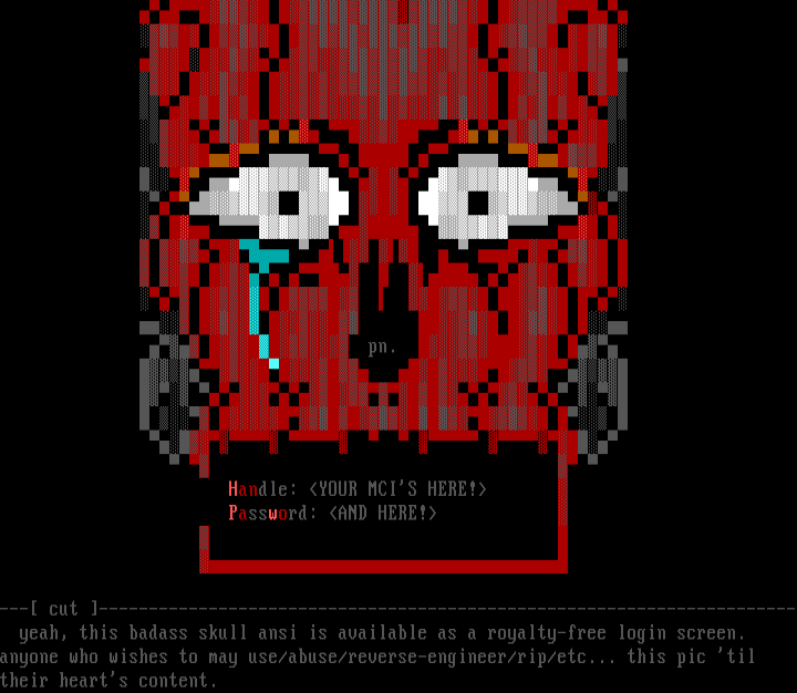 --- cut ---------------------------------------------------------------------- yeah, this badass skull ansi is available as a royalty-free login screen.