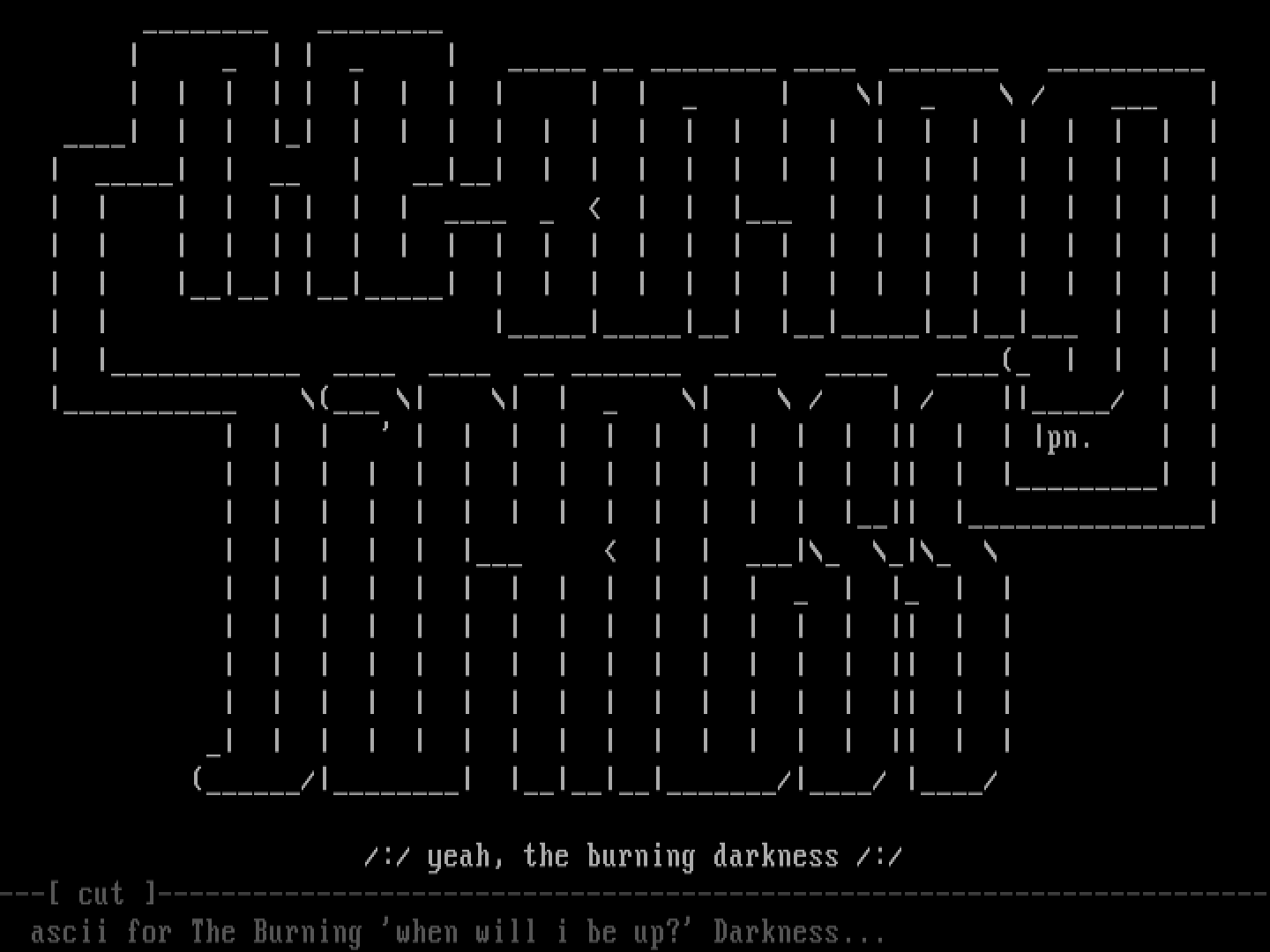 --- cut ---------------------------------------------------------------------- ascii for The Burning when will i be up? Darkness...