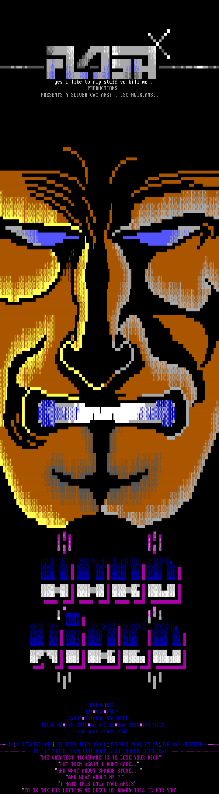 THiS STRANGE ANSi OF LESS THEN 100 LiNES WAS MADE BY SLiVER CuT ANOTHERONE OF THOSE FROM THAT DAMN GROUP NAMED FLASHtm THE GREATEST NIGHTMARE IS TO LOSE YOUR DICK