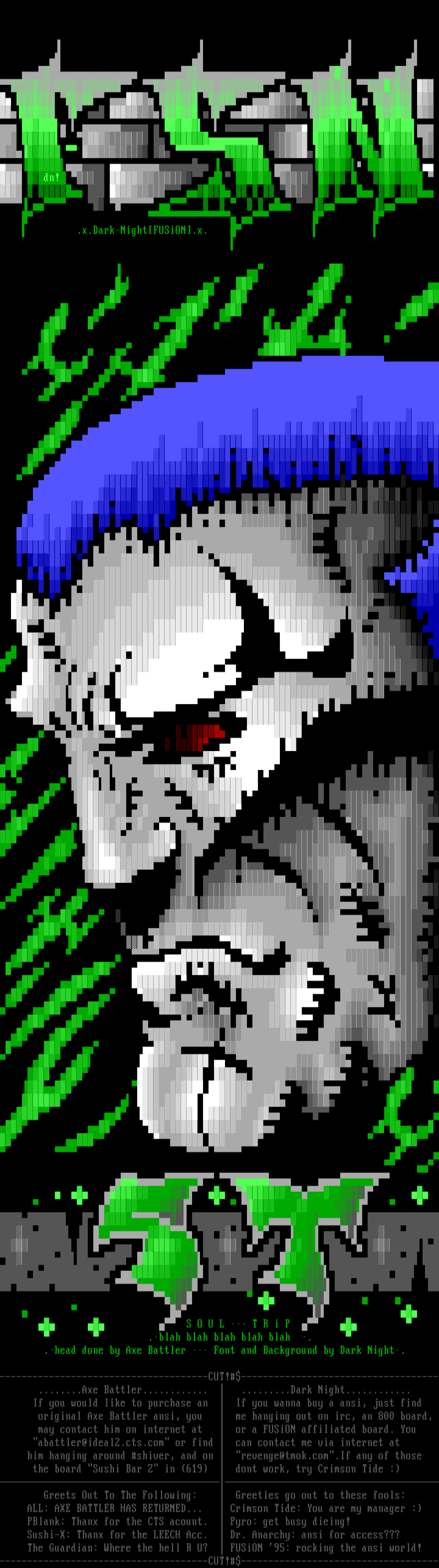 If you would like to purchase an If you wanna buy a ansi, just find original Axe Battler ansi, you me hanging out on irc, an 800 board, may contact him on internet at or a FUSiON affiliated board. You