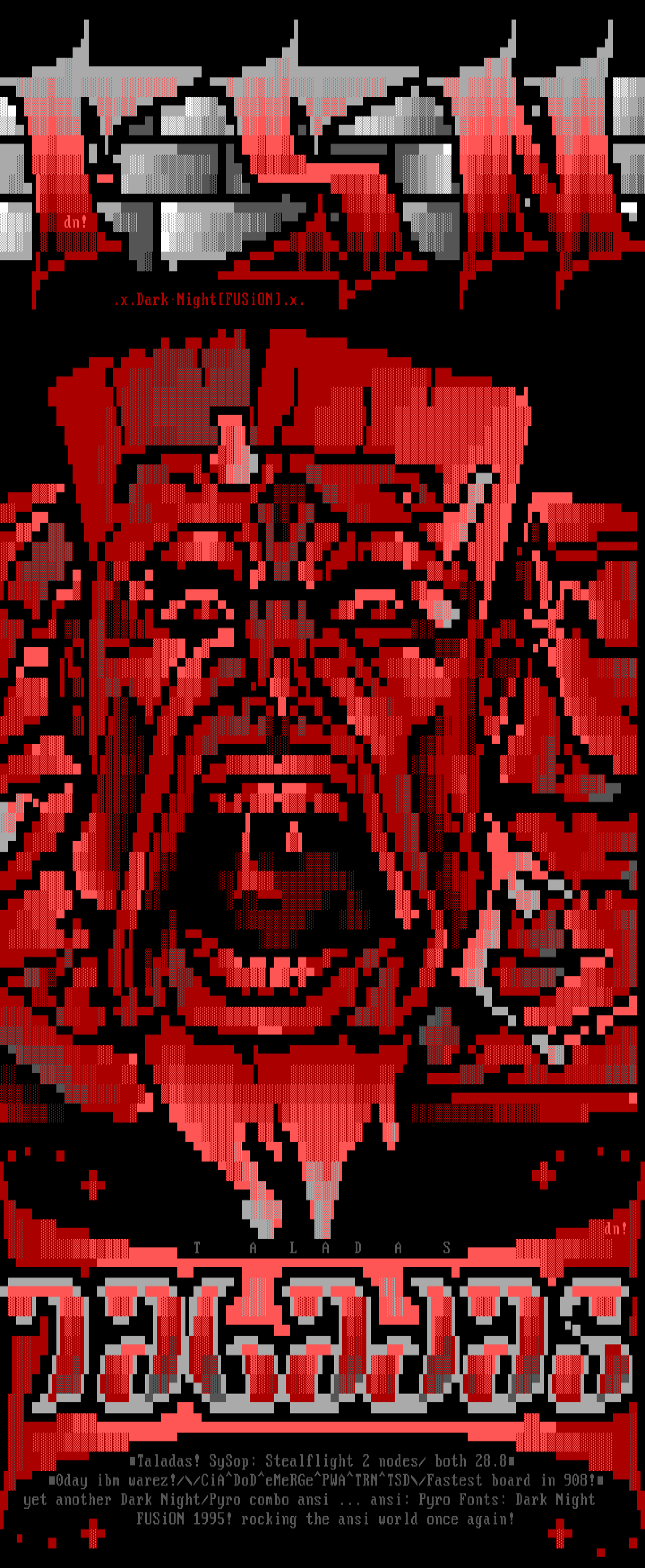 dn! T A L A D A S Taladas! SySop: Stealflight 2 nodes/ both 28.8 0day ibm warez!//CiADoDeMeRGePWATRNTSD/Fastest board in 908! yet another Dark Night/Pyro combo ansi ... ansi: Pyro Fonts: Dark Night FUSiON 1995! rocking the ansi world once again!