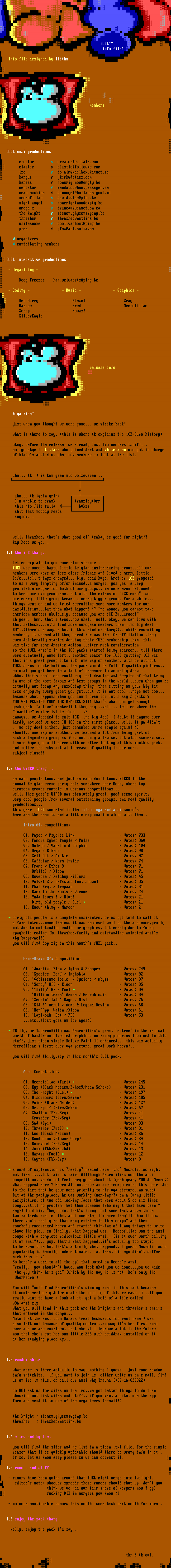 1.1 the iCE thang..let me explain to you something strange..fUEL was once a happy little belgian ansiproducing group..all ourmembers were more or less close friends and lived a merry little life...till things changed... big, read huge, brother iCE proposed to us a very tempting offer indeed..a merger..yes yes, a very profitable merger for both of our groups.. we were even allowed to keep our own groupname, but with the extension iCE euro..so our merry little group became a merry bigger group..for a while... things went on and we tried recruiting some more members for our ansidivision...but then what happend !? no-noooo, you cannot take american members obviously, because you are iCE Euuuurooo!.. ah yeah...hmm, thats true..now what...well, okay, we can live with that setback...lets find some european members then...no big deal.. BUT..theres always a but in this kind of story:...while recruiting members, it seemed all they cared for was the iCE affiliation..they even deliberatly started denying their fUEL membership..hmm..this was time for some drastic action...after much consideration... so the fUEL ansis in the iCE packs started being scarcer...till there were eventually none left.. another reason for fUEL quitting iCE was that in a great group like iCE, one way or another, with or without