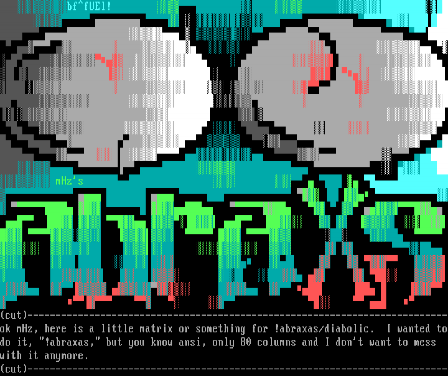 cut---------------------------------------------------------------------------ok mHz, here is a little matrix or something for !abraxas/diabolic. I wanted todo it, !abraxas, but you know ansi, only 80 columns and I dont want to mess