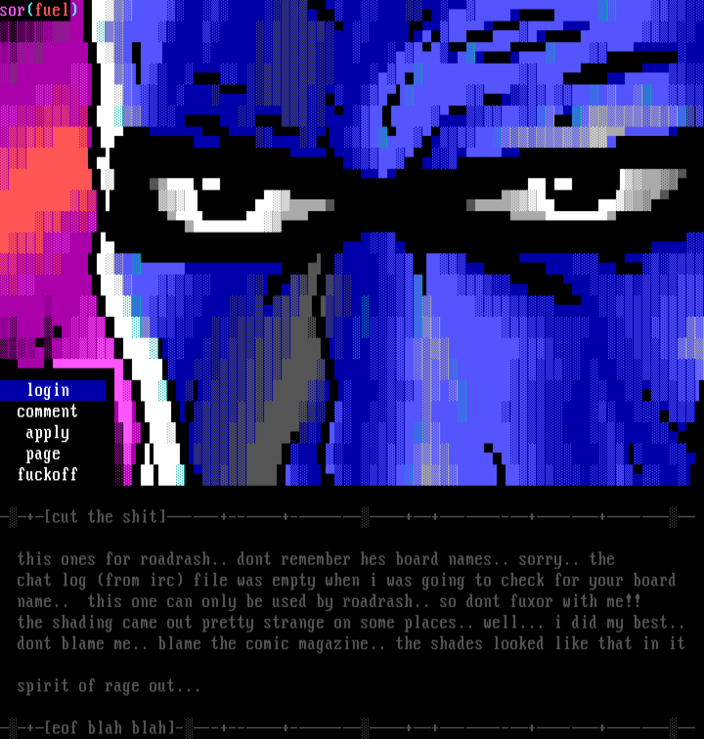 chat log from irc file was empty when i was going to check for your board name.. this one can only be used by roadrash.. so dont fuxor with me!!