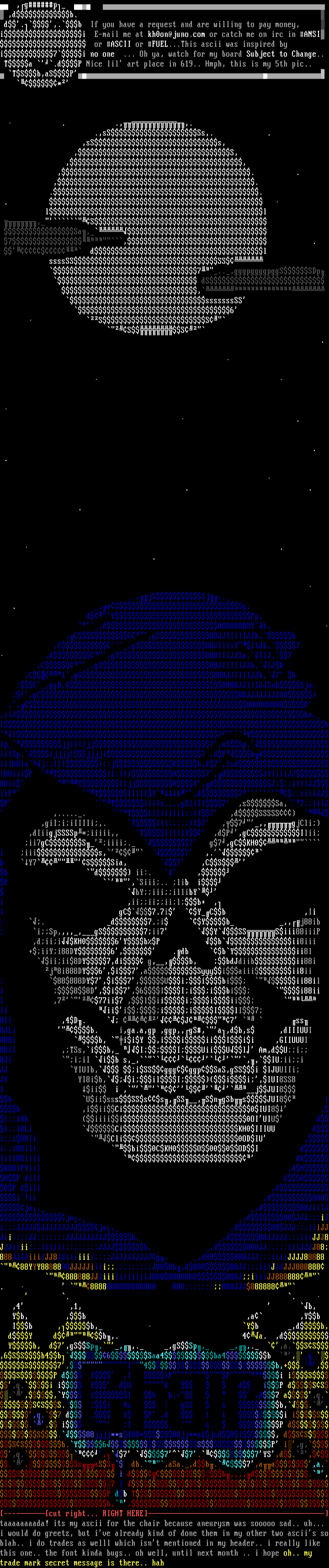 ,4 ,1, b, Yb, ,b ,a ,Yb Ib ,b, Yb ,db, dY db,. 4a. ,d Yb, d7,gSSp,,,. ,gSSp, ,,. ,a.SS,6SSb4b6Saa4ba4b ,,q.S7,I4b,+.,SP d I ,I iPPi iS,q.i i l dU d d iP dSS.,,Y iI b b, ,d7 a,q.SSS. i 4s : gSS s b,.,,q.7 d . I P ,d i i i iS., i I . s P dS.88jjjj**sd88*88jj**sdjsd8l, dSSSSb.Y6SSP i,g,,q.,7 77.7YS,d.,.,SsaSS db.,aSa.,db.7,aa,a.S i db,,,,d.,7 l P db Tb,,---cut right... RIGHT HERE-taaaaaaaada! its my ascii for the chair because aneurysm was sooooo sad.. uh... i would do greetz, but ive already kind of done them in my other two asciis soblah.. i do trades as welll which isnt mentioned in my header.. i really like