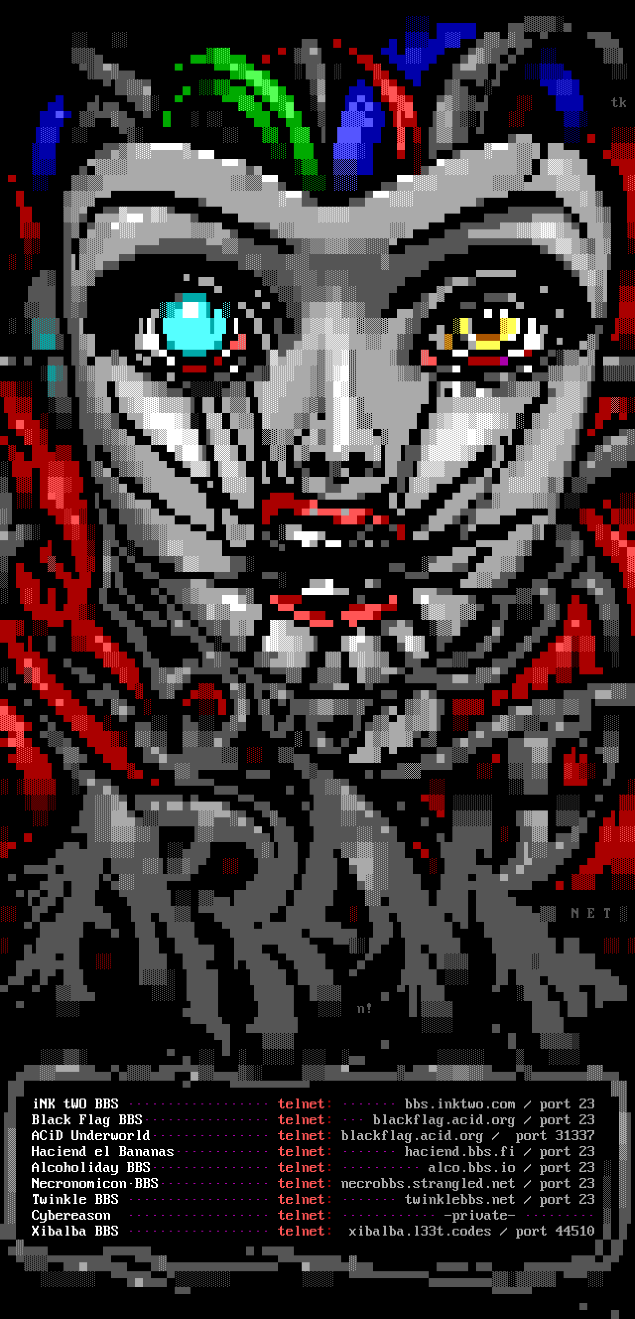 Black Flag BBS telnet: blackflag.acid.org / port 23 ACiD Underworld telnet: blackflag.acid.org / port 31337 Haciend el Bananas telnet: haciend.bbs.fi / port 23 Alcoholiday BBS telnet: alco.bbs.io / port 23 NecronomiconBBS telnet: necrobbs.strangled.net / port 23 Twinkle BBS telnet: twinklebbs.net / port 23 Cybereason telnet: -private- Xibalba BBS telnet: xibalba.l33t.codes / port 44510