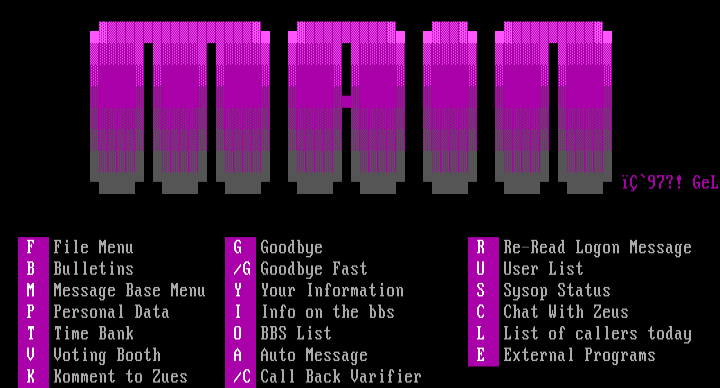 F File Menu G Goodbye R Re-Read Logon Message B Bulletins /GGoodbye Fast U User List M Message Base Menu Y Your Information S Sysop Status P Personal Data I Info on the bbs C Chat With Zeus T Time Bank O BBS List L List of callers today