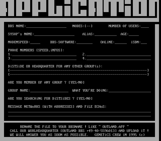 CALL OUR WORLHEADQUARTER OUTLAND BBS +49-40-5596013 AND UPLOAD iT !