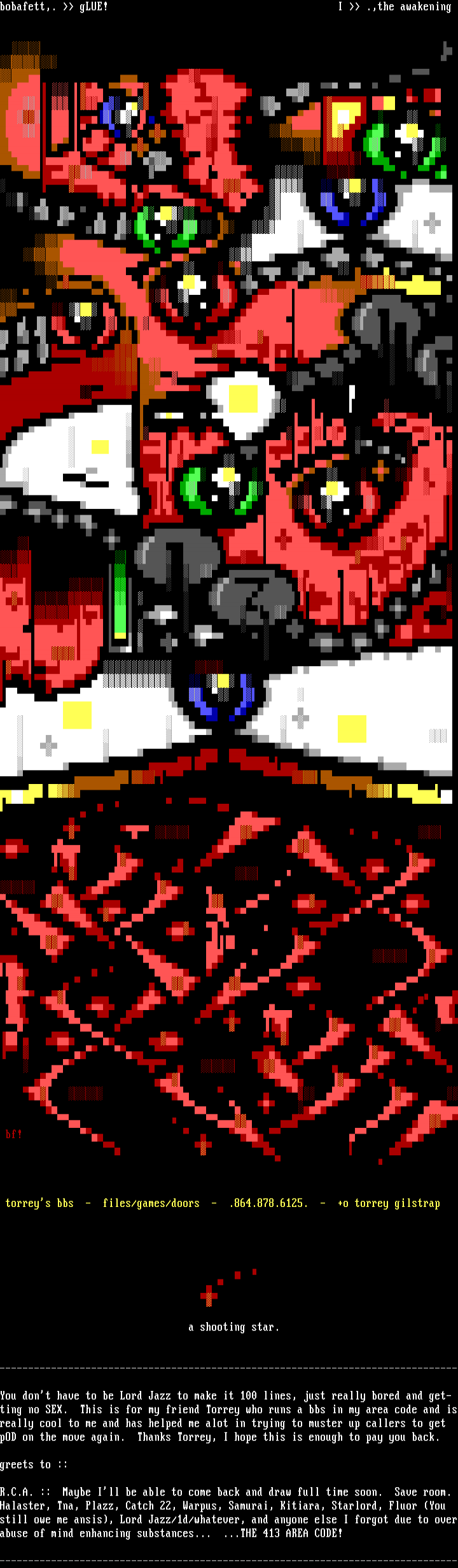 ting no SEX. This is for my friend Torrey who runs a bbs in my area code and isreally cool to me and has helped me alot in trying to muster up callers to get