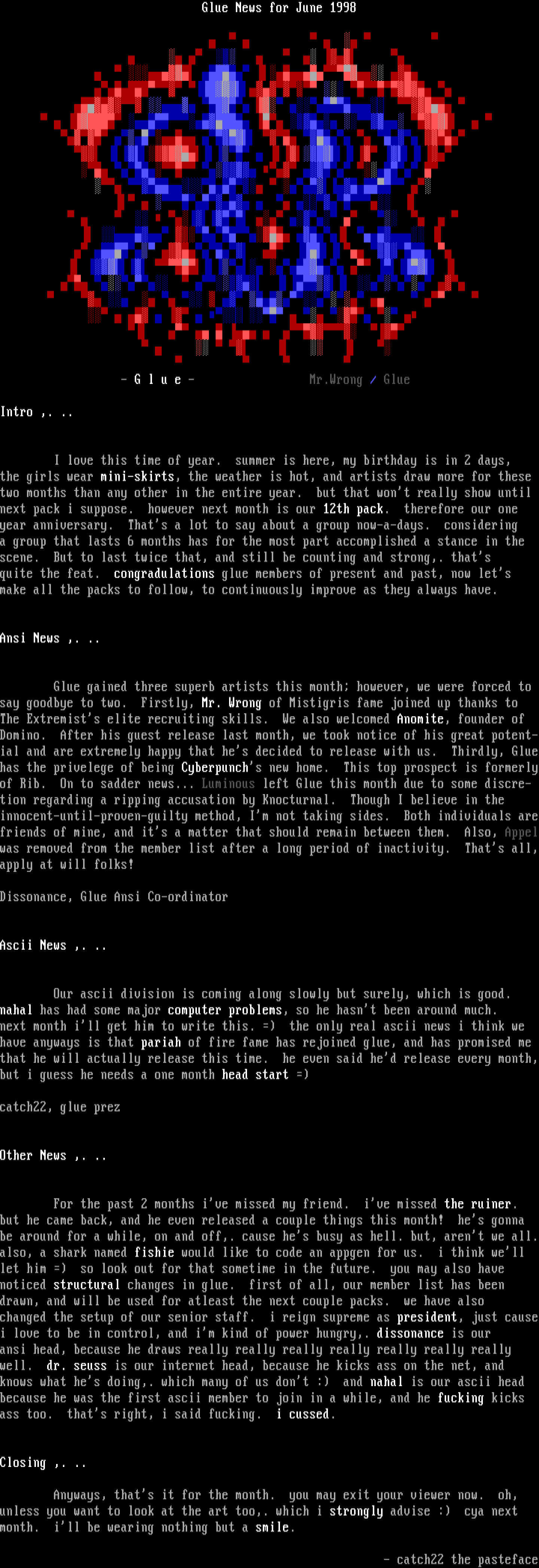 Domino. After his guest release last month, we took notice of his great potent-ial and are extremely happy that hes decided to release with us. Thirdly, Gluehas the privelege of being Cyberpunchs new home. This top prospect is formerlyof Rib. On to sadder news... Luminous left Glue this month due to some discre- tion regarding a ripping accusation by Knocturnal. Though I believe in the innocent-until-proven-guilty method, Im not taking sides. Both individuals arefriends of mine, and its a matter that should remain between them. Also, Appelwas removed from the member list after a long period of inactivity. Thats all,apply at will folks!