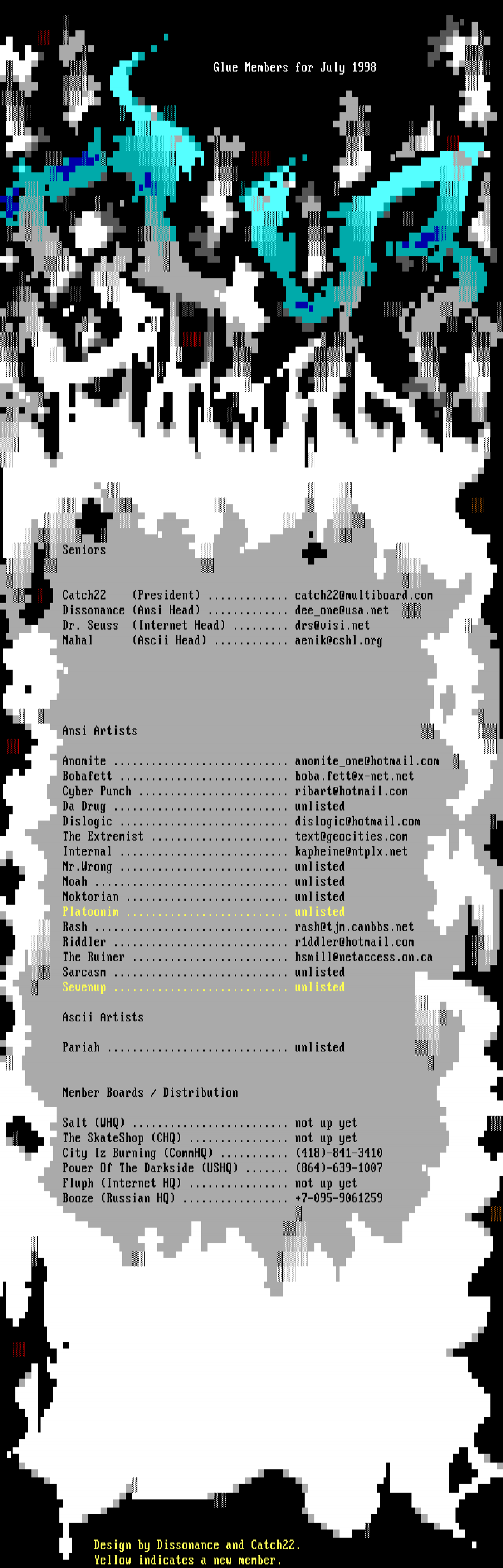 Seniors Catch22President .............catch22@multiboard.com DissonanceAnsi Head............. deeone@usa.net Dr. Seuss Internet Head......... drs@visi.net NahalAscii Head............ aenik@cshl.org Ansi Artists