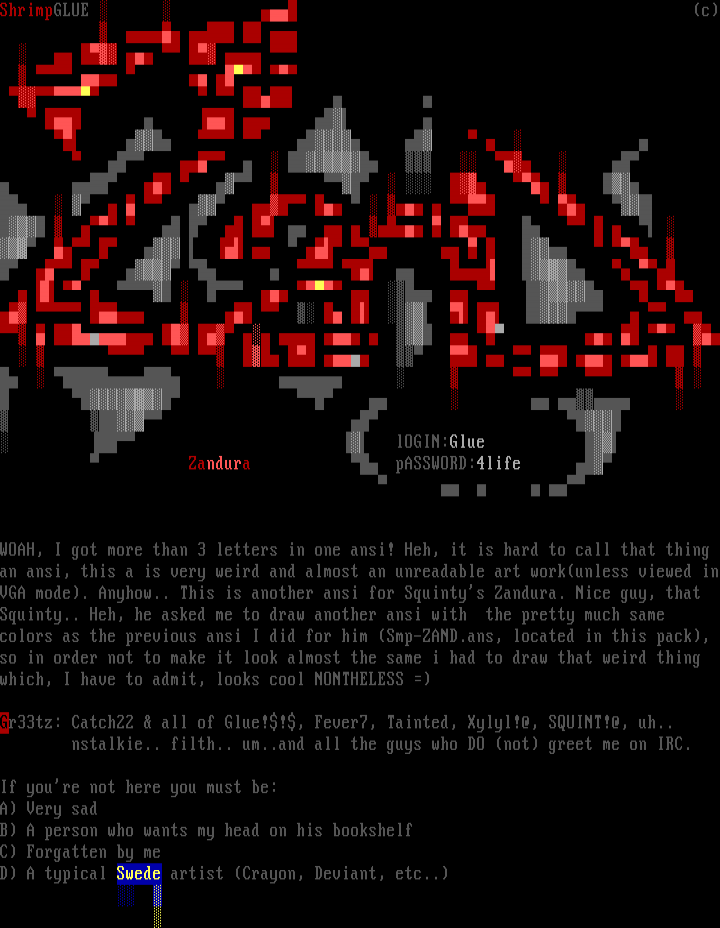 an ansi, this a is very weird and almost an unreadable art workunless viewed inVGA mode. Anyhow.. This is another ansi for Squintys Zandura. Nice guy, that