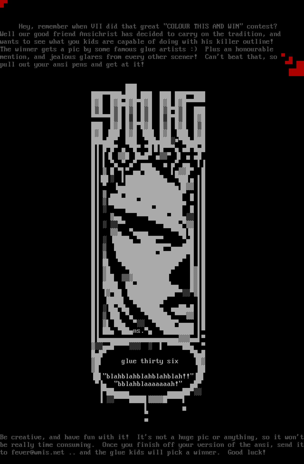 Be creative, and have fun with it! Its not a huge pic or anything, so it wontbe really time consuming. Once you finish off your version of the ansi, send itto fever@wmis.net .. and the glue kids will pick a winner. Good luck!