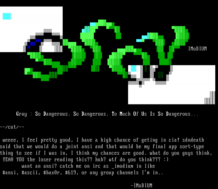 ansi, ascii, hax0r, 619, or any group channels Im in..
