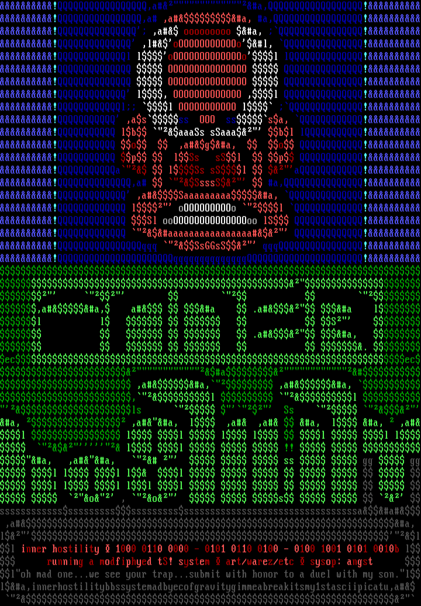 lll inner hostility 1000 0110 0000 - 0101 0110 0100 - 0100 1001 0101 0010b l running a modfiphyed tS! system art/warez/etc sysop: angst loh mad one...we see your trap...submit with honor to a duel with my son.lla,innerhostilitybbssystemadbyecofgravitygimmeabreakitsmy1stasciipicatu,a