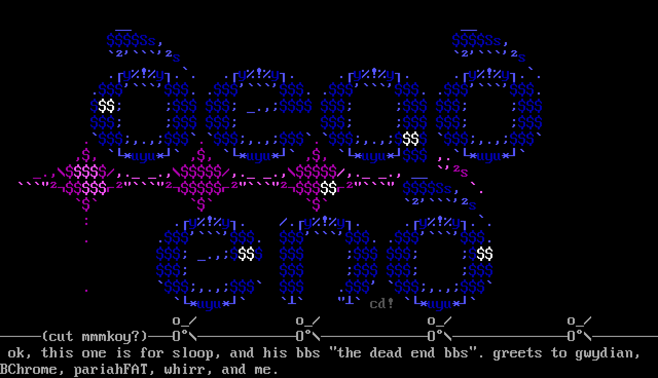 cut mmmkoy?OOOO ok, this one is for sloop, and his bbs the dead end bbs. greets to gwydian,