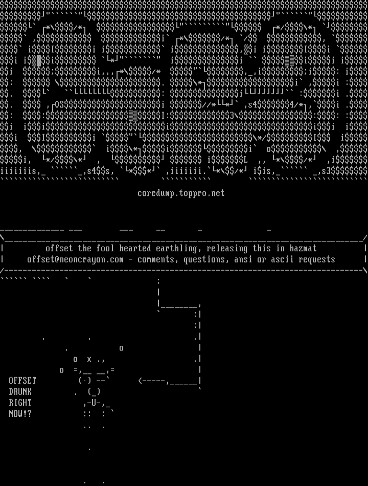 / offset the fool hearted earthling, releasing this in hazmat offset@neoncrayon.com - comments, questions, ansi or ascii requests /------------------------------------------------------------------------------ :