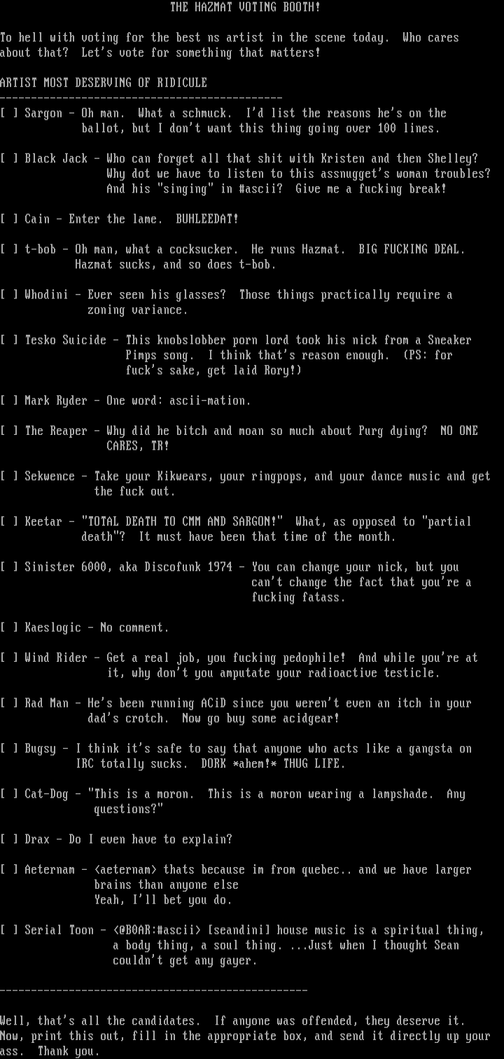 t-bob - Oh man, what a cocksucker. He runs Hazmat. BIG FUCKING DEAL.