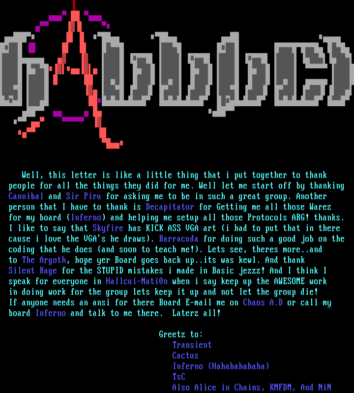 If anyone needs an ansi for there Board E-mail me on Chaos A.D or call my