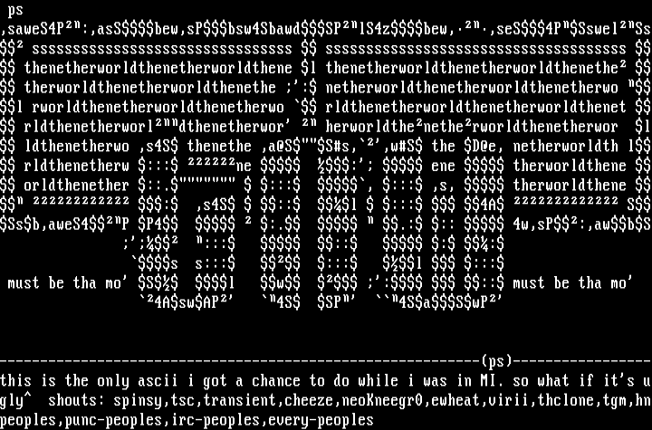 -----------------------------------------------------------ps-----------------this is the only ascii i got a chance to do while i was in MI. so what if its ugly shouts: spinsy,tsc,transient,cheeze,neoKneegr0,ewheat,virii,thclone,tgm,hnpeoples,punc-peoples,irc-peoples,every-peoples
