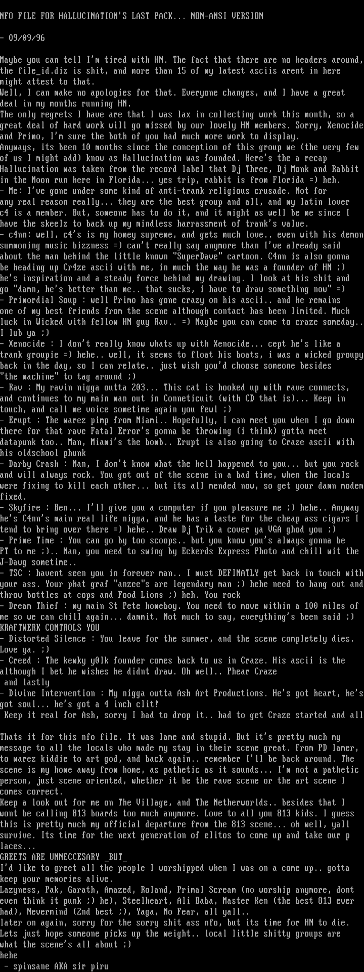 Maybe you can tell Im tired with HN. The fact that there are no headers around,the fileid.diz is shit, and more than 15 of my latest asciis arent in here
