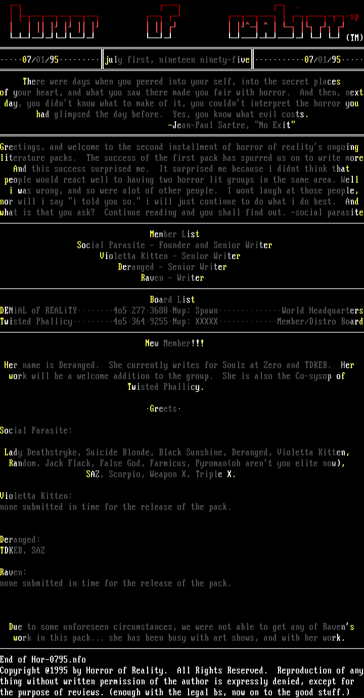 Copyright @1995 by Horror of Reality. All Rights Reserved. Reproduction of anything without written permission of the author is expressly denied, except for