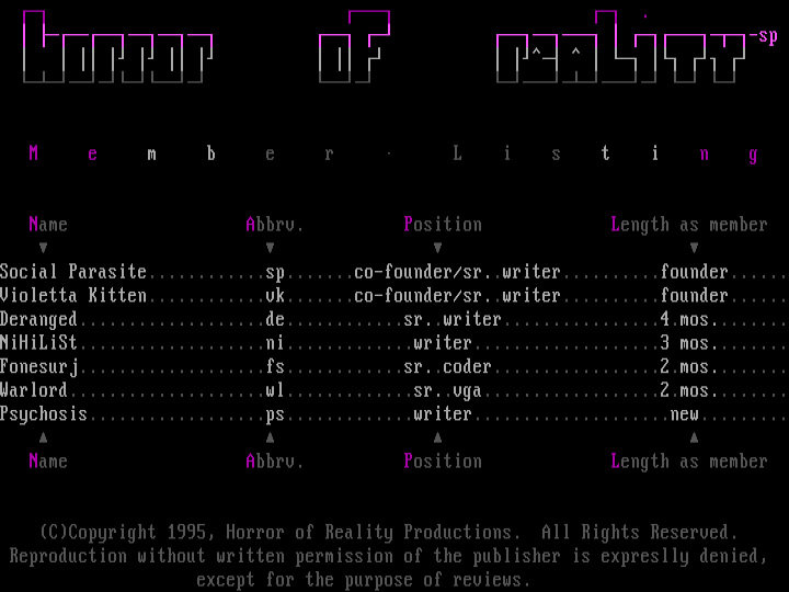 Social Parasite............sp.......co-founder/sr..writer..........founder......Violetta Kitten............vk.......co-founder/sr..writer..........founder......Deranged...................de............sr..writer................4.mos........NiHiLiSt...................ni.............writer...................3 mos........Fonesurj...................fs............sr..coder.................2.mos........Warlord....................wl.............sr..vga..................2.mos........Psychosis..................ps.............writer....................new.........