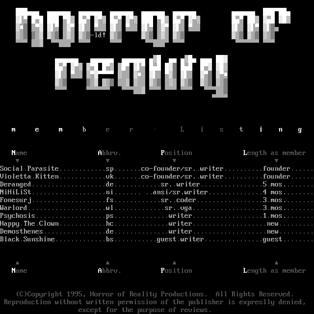 Social.Parasite............sp.......co-founder/sr..writer..........founder......Violetta.Kitten............vk.......co-founder/sr..writer..........founder......Deranged...................de............sr..writer................5.mos........NiHiLiSt...................ni....... ..ansi/sr.writer..............4 mos........Fonesurj...................fs............sr..coder.................3.mos........Warlord....................wl.............sr..vga..................3.mos........Psychosis..................ps..............writer..................1.mos........Happy.The.Clown............hc..............writer...................new.........Demosthenes................de..............writer...................new.........Black.Sunshine.............bs...........guest.writer...............guest........